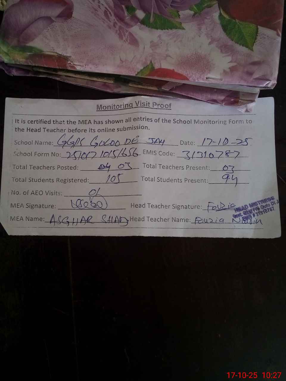 | Attendance Register | Head Teacher | MEA with School | Visit Proof |