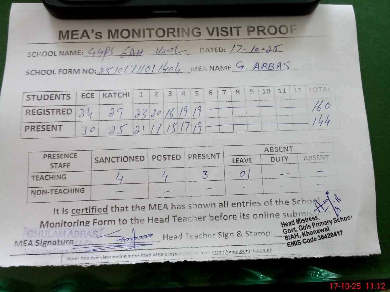 | Attendance Register | Head Teacher | MEA with School | Visit Proof |