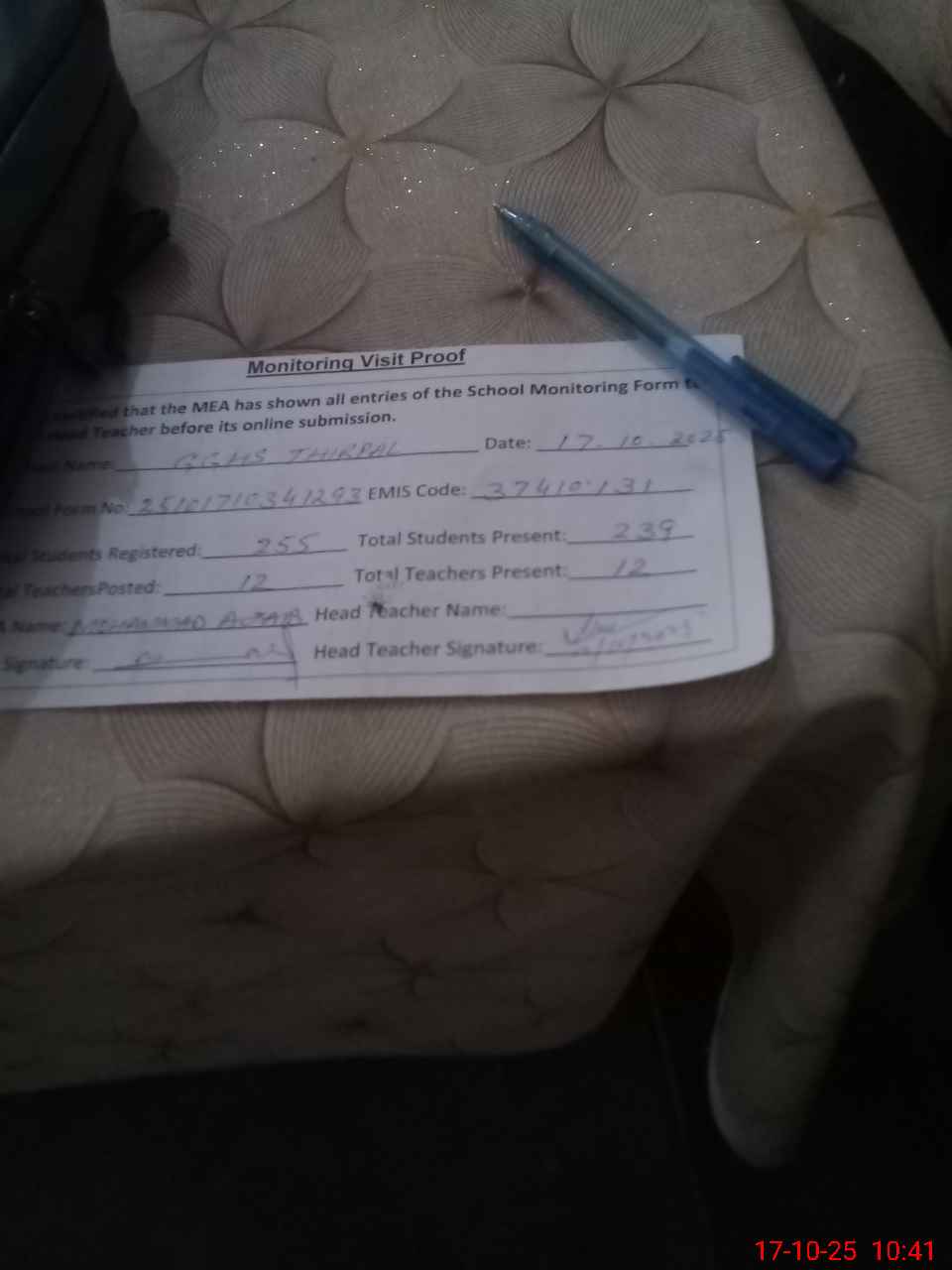| EMIS Code: 37410131 | Name of School: GGHS THIRPAL | |||