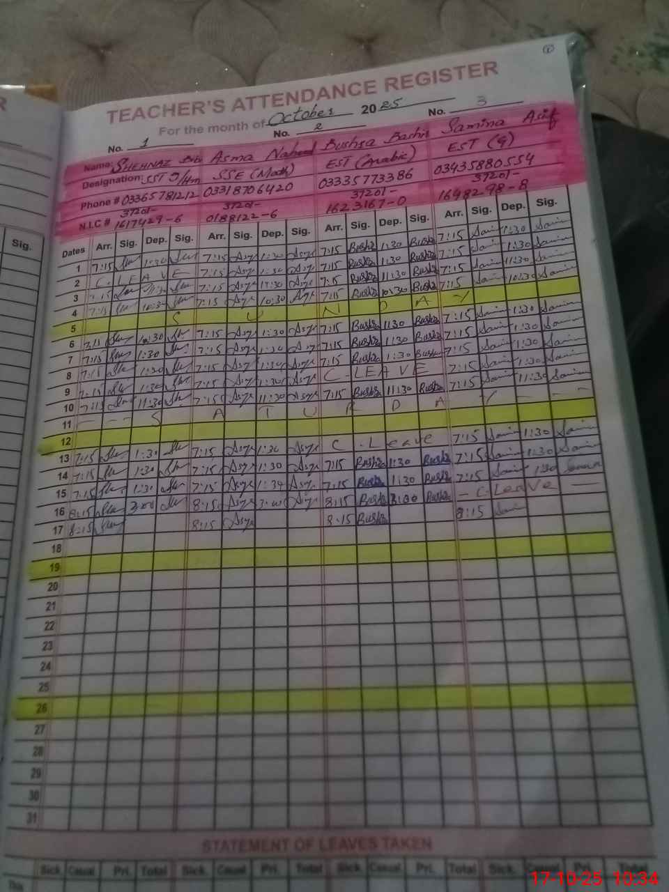 | CNIC | Full Name | Designation | R/C | Absence During Last Calender Month |