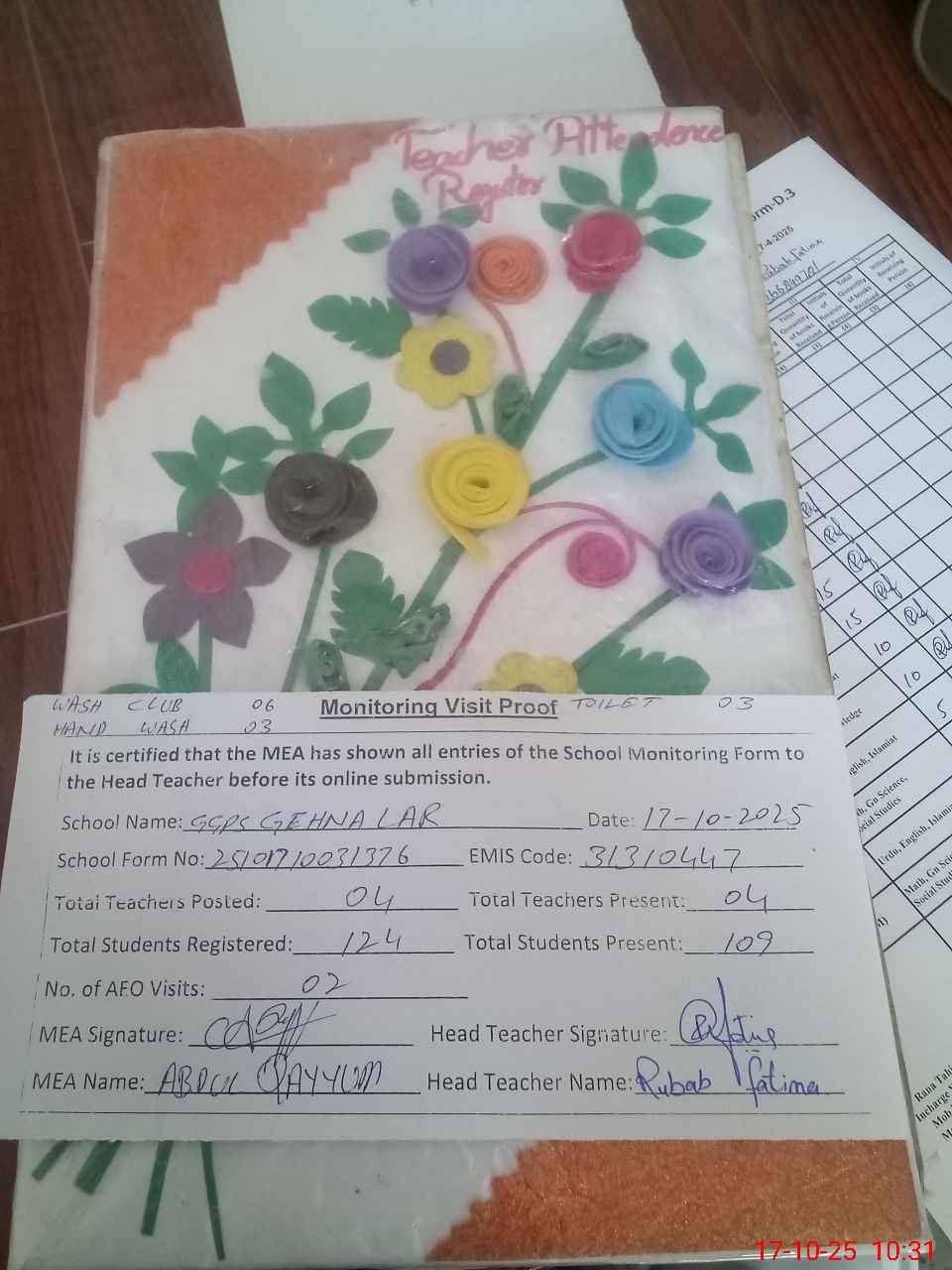 | Attendance Register | Head Teacher | MEA with School | Visit Proof |