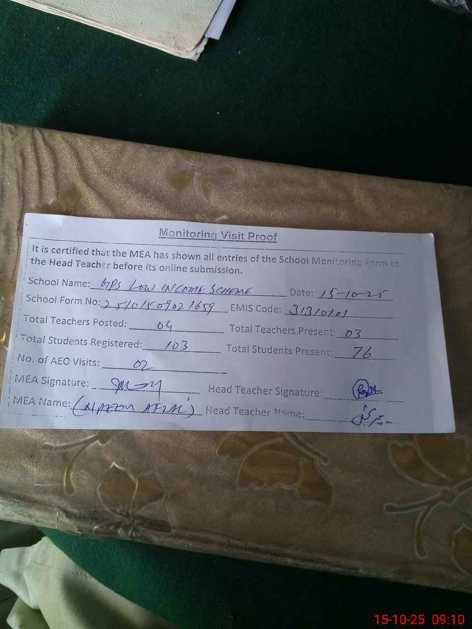 | Attendance Register | Head Teacher | MEA with School | Visit Proof |