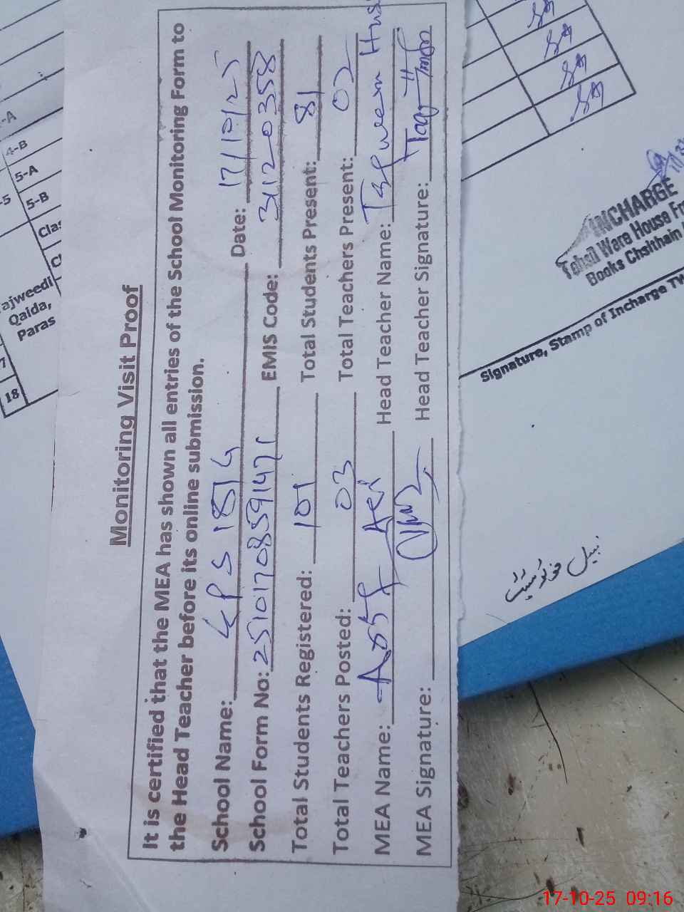 | Attendance Register | Head Teacher | MEA with School | Visit Proof |