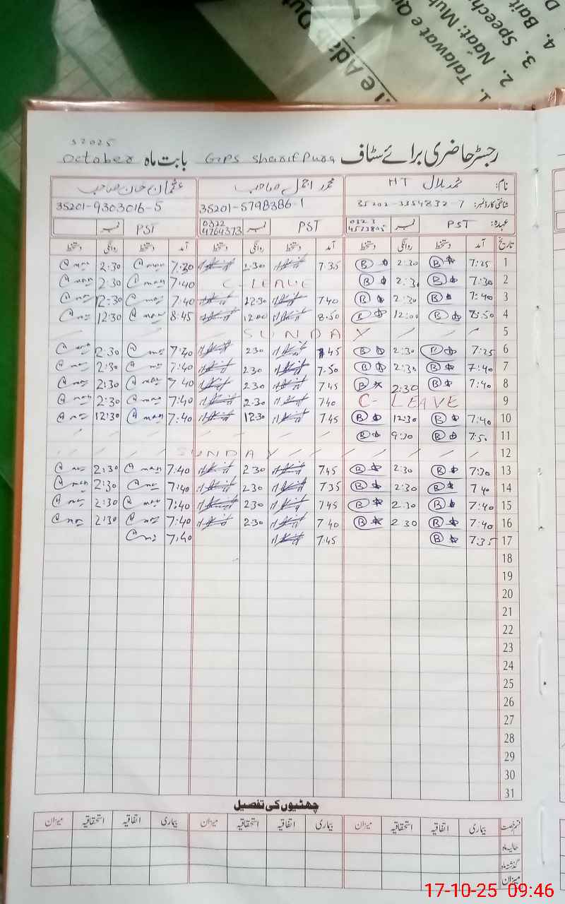 | CNIC | Full Name | Designation | R/C | Absence during last cal. month |