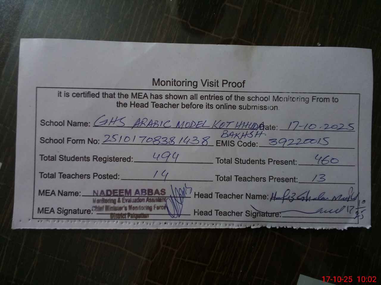 | EMIS Code: 39220015 | Name of School: GHS ARABIC MODEL KOT KHUDA BAKHSH | |||