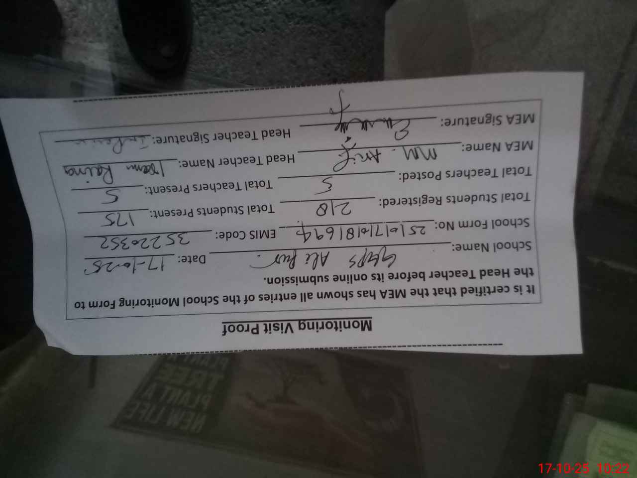 | Attendance Register | Head Teacher | MEA with School | Visit Proof |