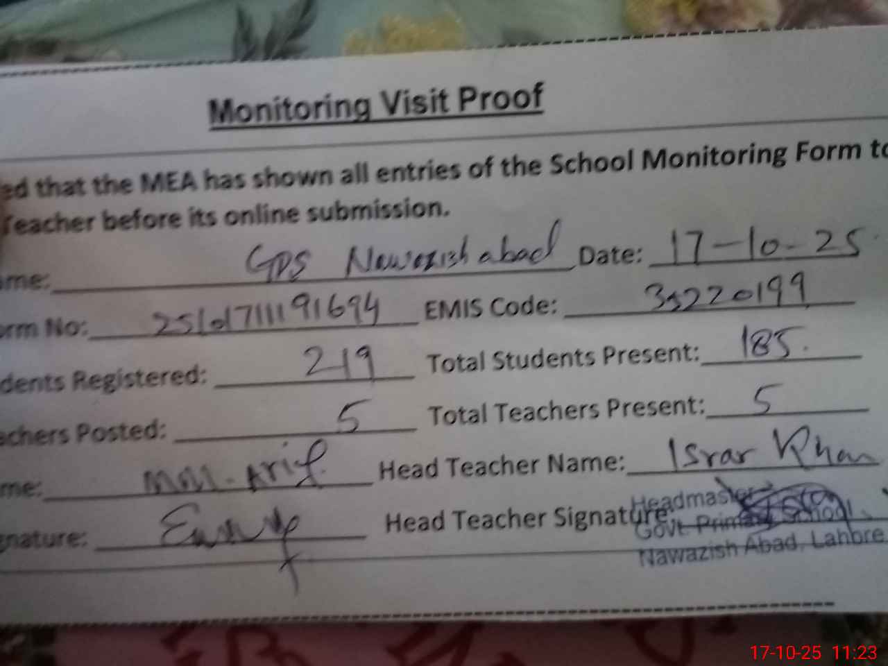 | EMIS Code: 35220199 | Name of School: GPS NAWAZISH ABAD RAIWIND ROAD | |||