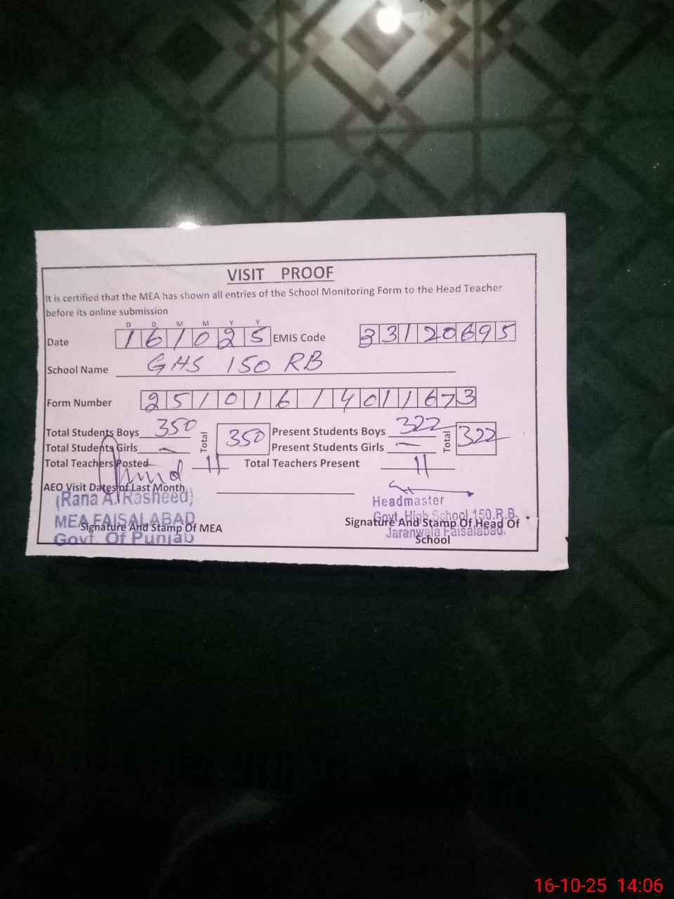 | Certified that this School was Inspected by the Undersigned MEA/DMO Today and the Information Stated Above is as Per Record. | |||||