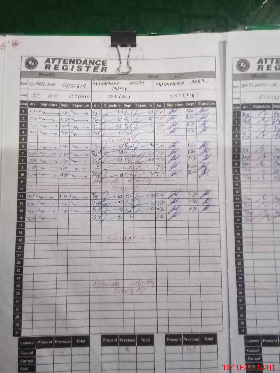 | CNIC | Full Name | Designation | R/C | Absence During Last Calender Month |