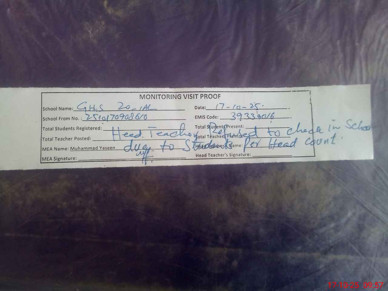 | Attendance Register | Head Teacher | MEA with School | Visit Proof |