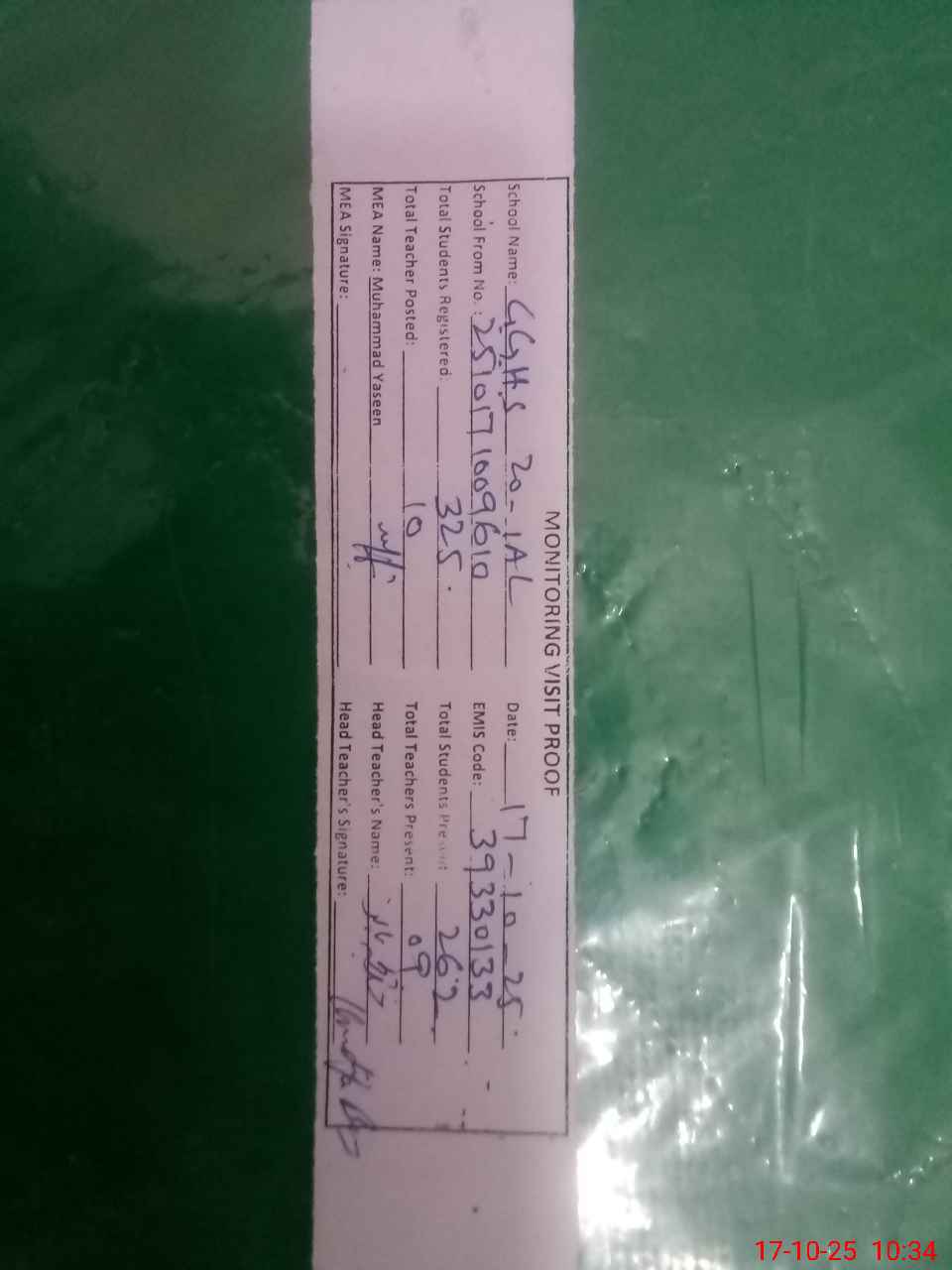 | Attendance Register | Head Teacher | MEA with School | Visit Proof |