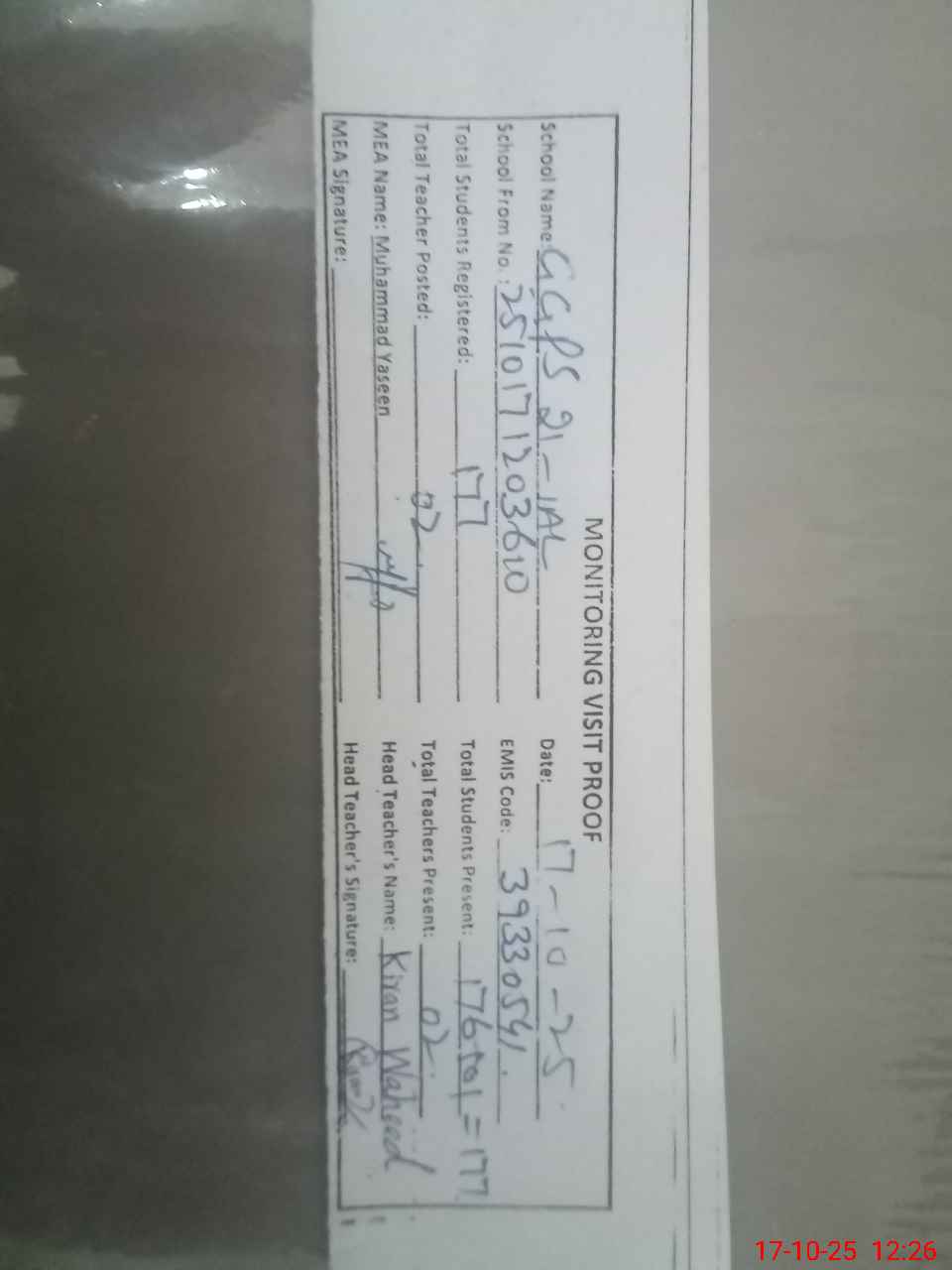 | Attendance Register | Head Teacher | MEA with School | Visit Proof |