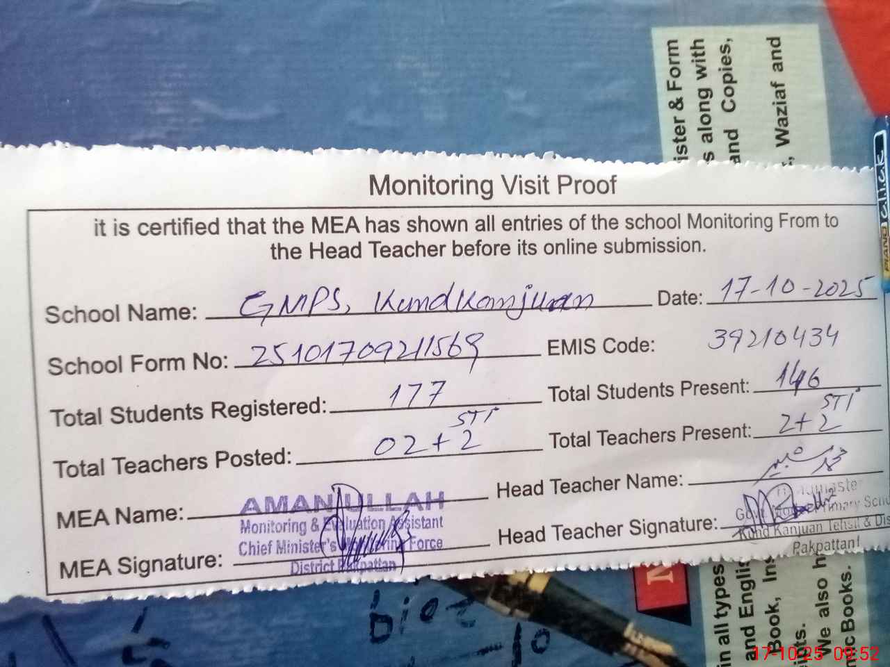 | Attendance Register | Head Teacher | MEA with School | Visit Proof |