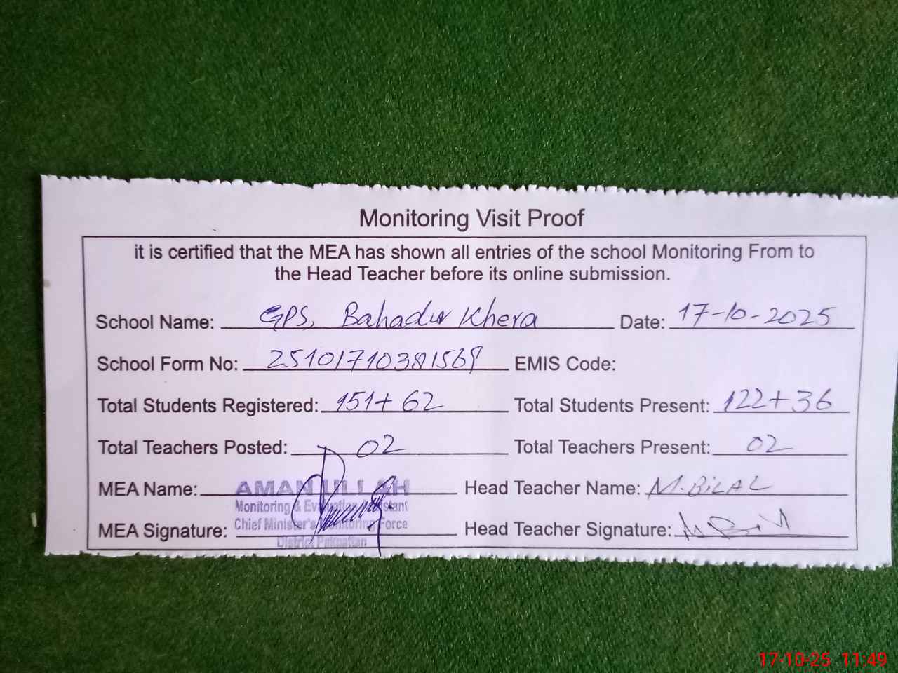 | EMIS Code: 39210586 | Name of School: GPS BAHADUR KHERRA | |||
