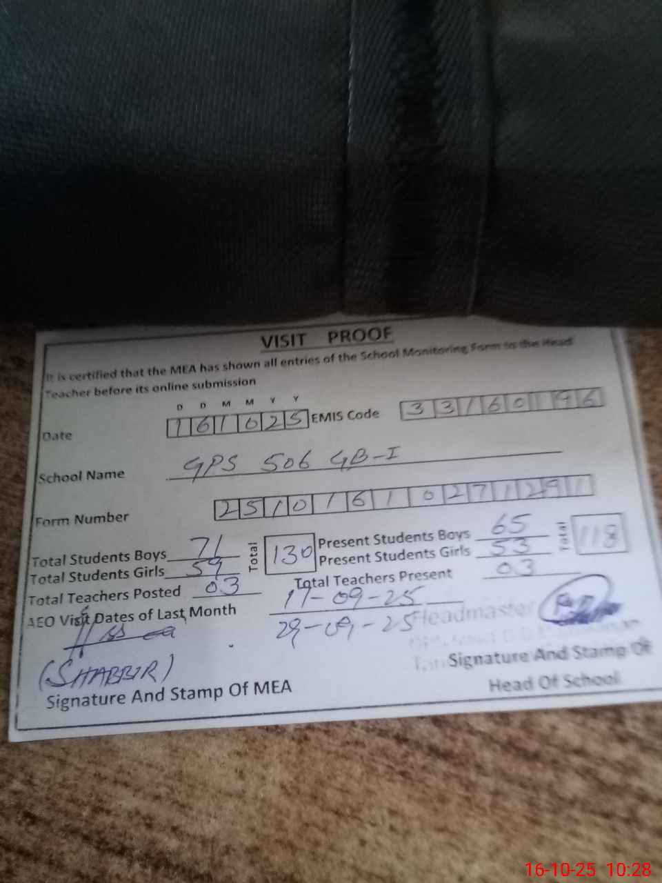 | Attendance Register | Head Teacher | MEA with School | Visit Proof |