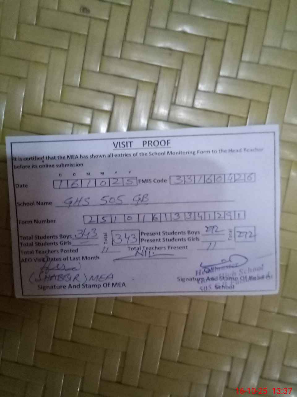 | Certified that this School was Inspected by the Undersigned MEA/DMO Today and the Information Stated Above is as Per Record. | |||||