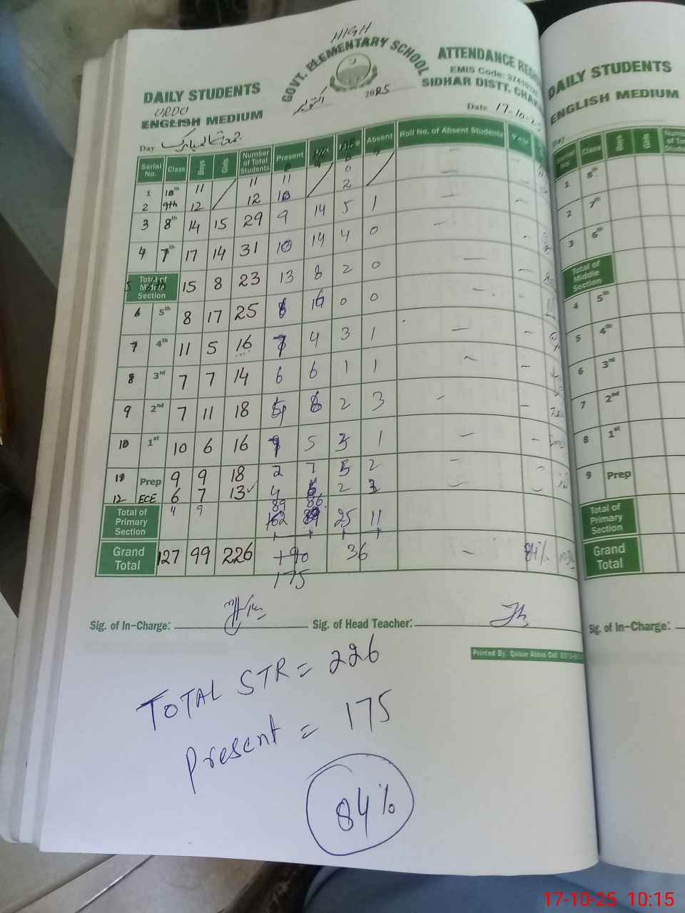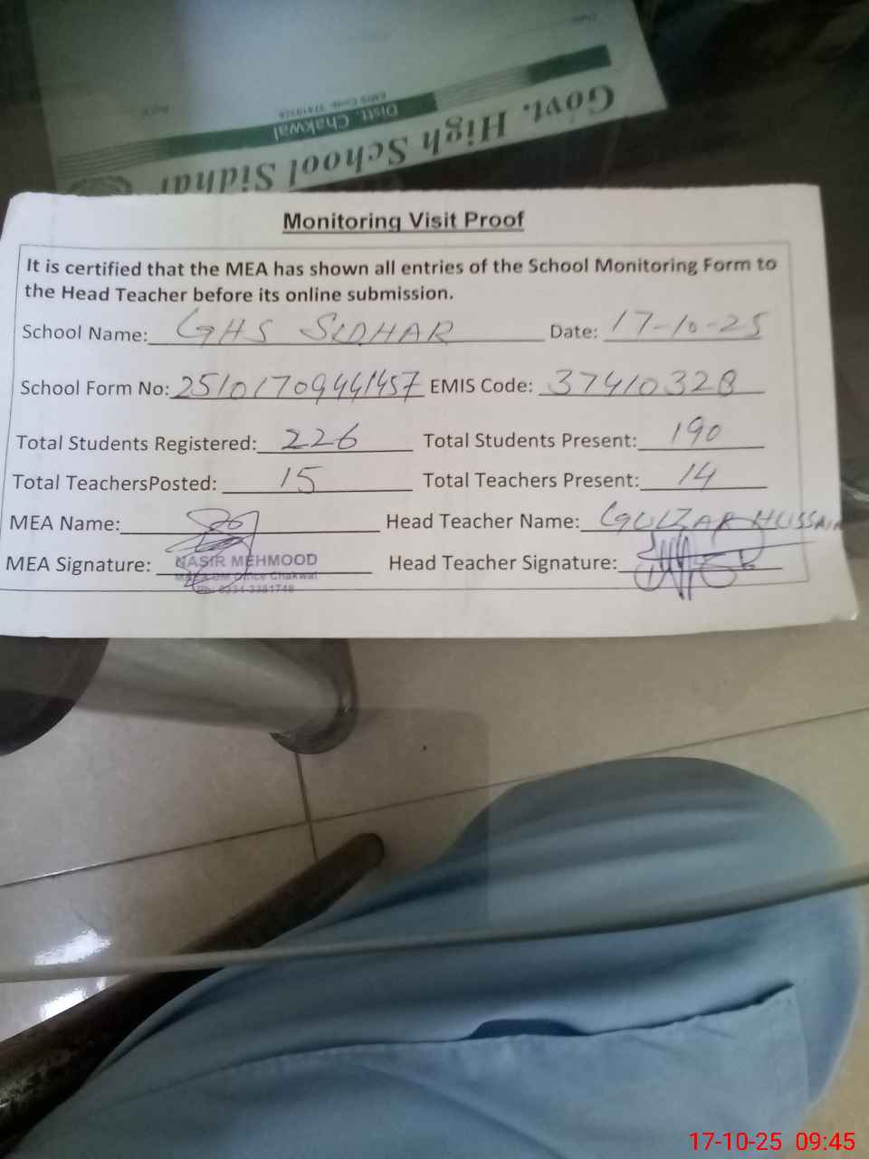 | Remarks (Use Separate Page if Required): Need IT teacher at Ghs Sidhar Need NSB for white washing of whole school including boundary wall and maintenance of rooves approximately rupees 5 LAC on urgent basis Two new teacher join this school Hasnat Haider PST 3720116410389 and Najam Shahzad PST 37201405118161 It is requested that please add their name in MEAs Tab Submitted please | |||||