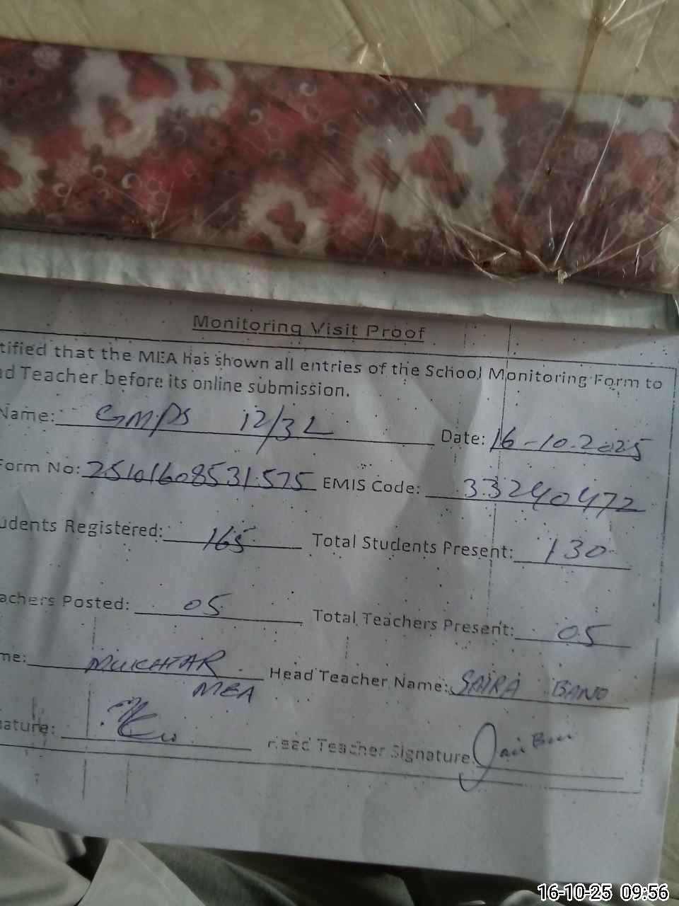 | Attendance Register | Head Teacher | MEA with School | Visit Proof |