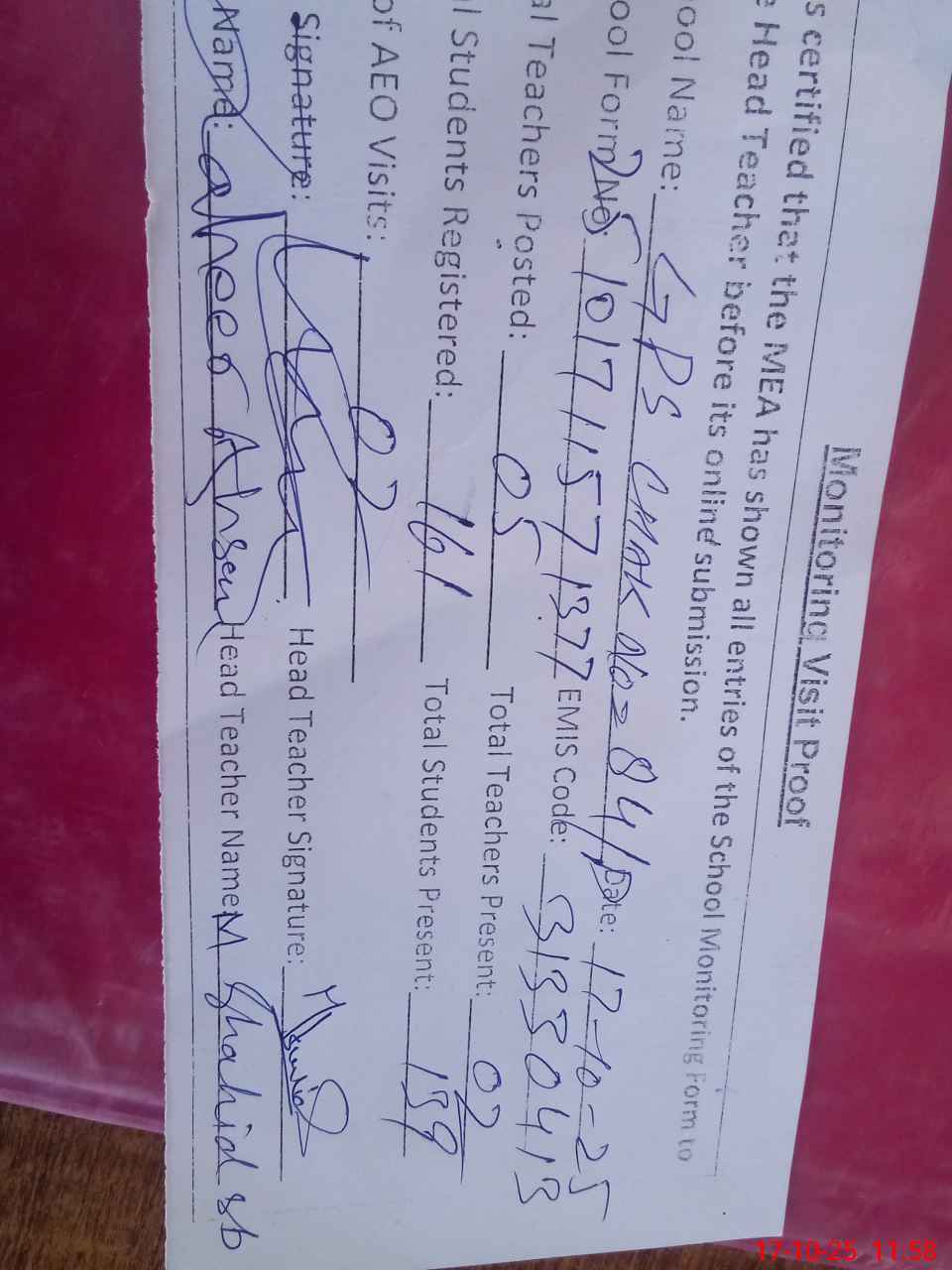 | Attendance Register | Head Teacher | MEA with School | Visit Proof |