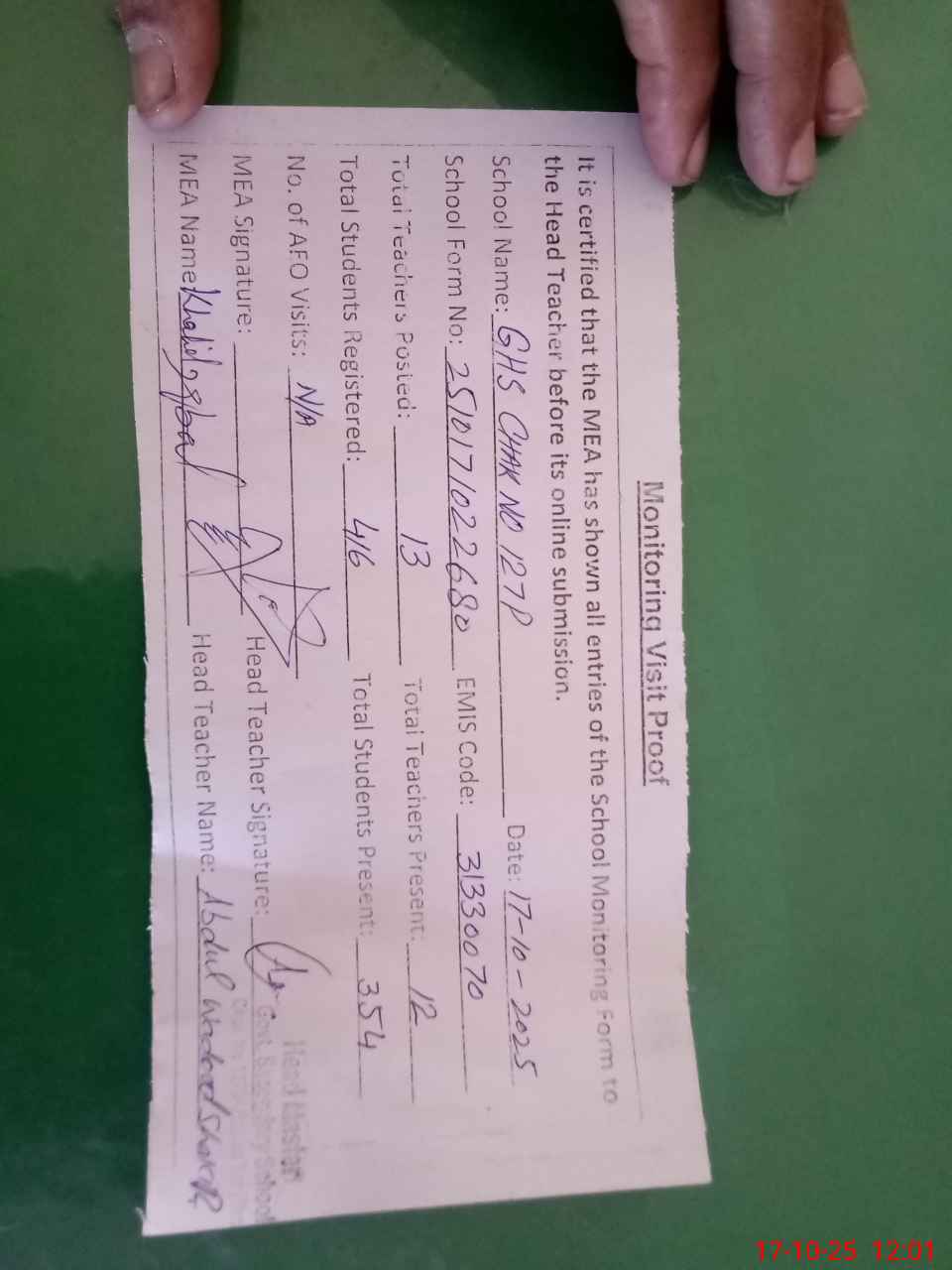 | Attendance Register | Head Teacher | MEA with School | Visit Proof |