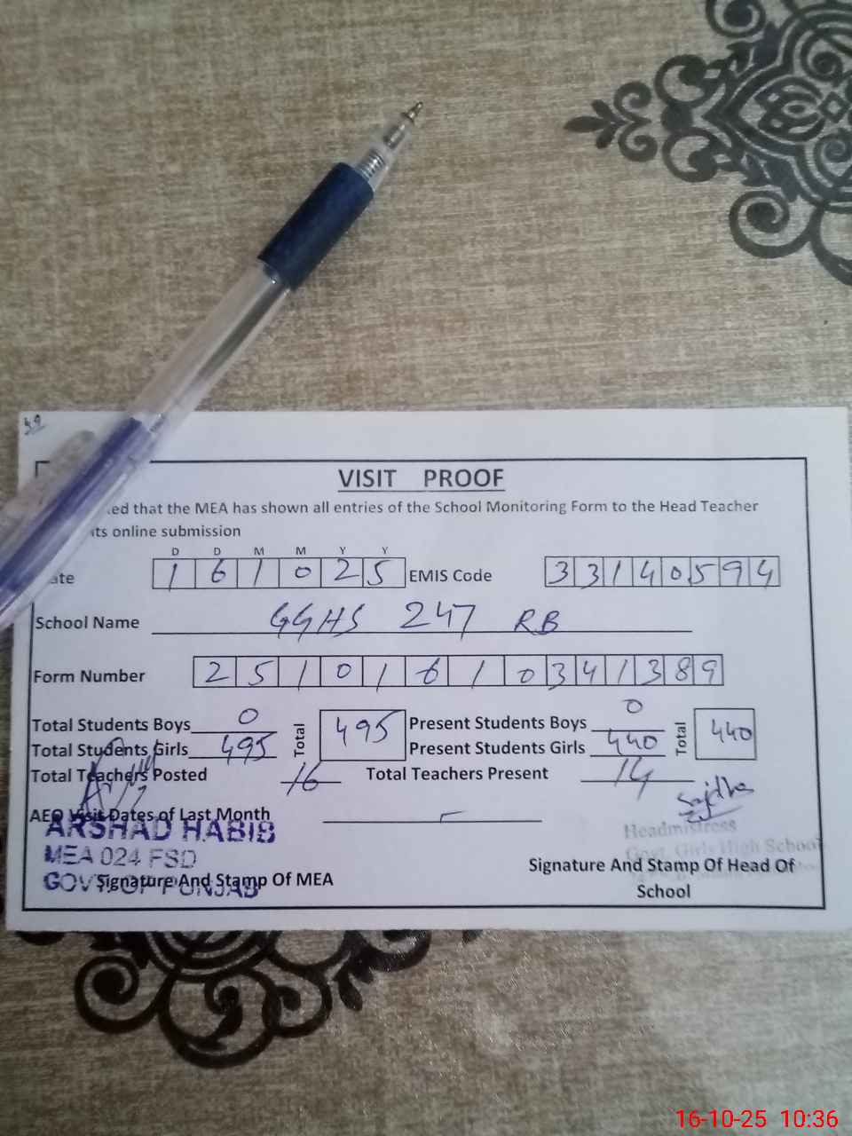 | Certified that this School was Inspected by the Undersigned MEA/DMO Today and the Information Stated Above is as Per Record. | |||||