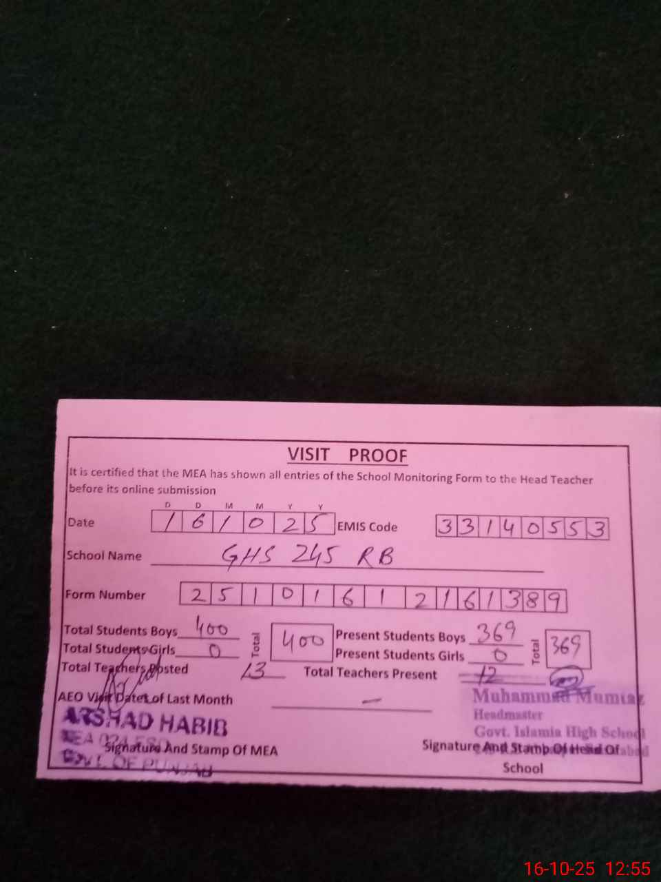 | Certified that this School was Inspected by the Undersigned MEA/DMO Today and the Information Stated Above is as Per Record. | |||||