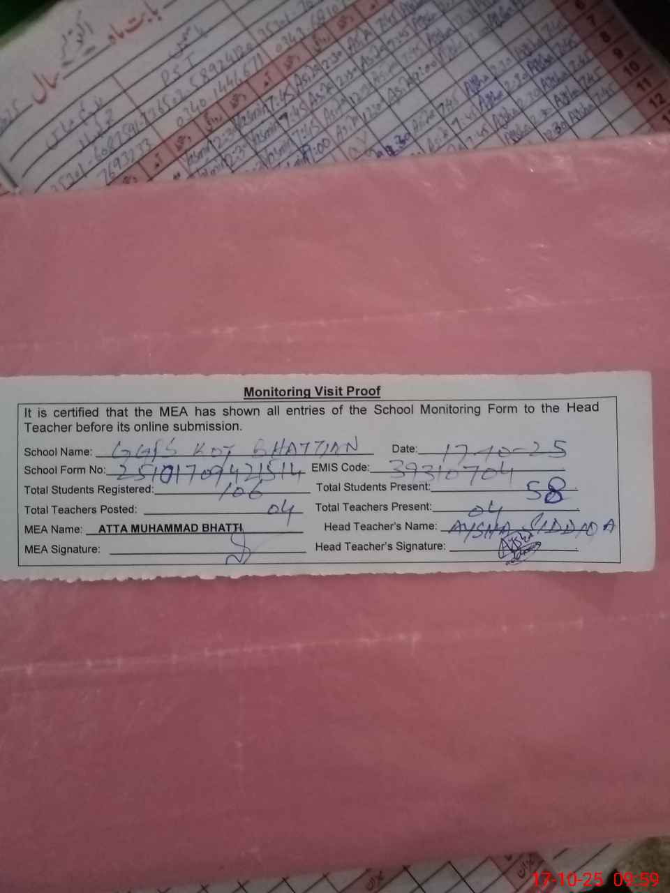 | EMIS Code: 39310704 | Name of School: GGPS KOT BHATIAN | |||