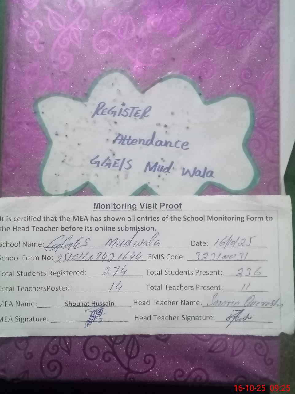 | Attendance Register | Head Teacher | MEA with School | Visit Proof |