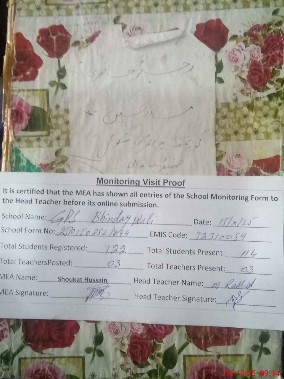 | Attendance Register | Head Teacher | MEA with School | Visit Proof |