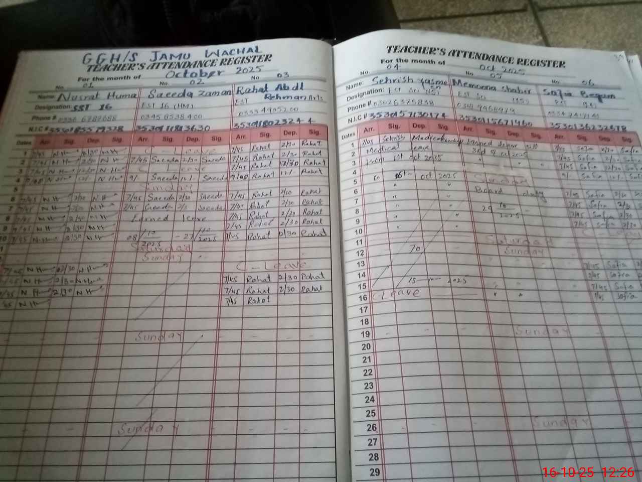 | CNIC | Full Name | Designation | R/C | Absence during last cal. month |