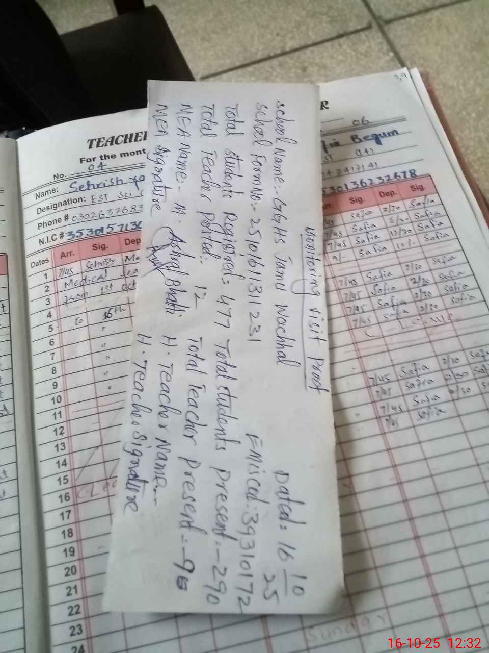 | Attendance Register | Head Teacher | MEA with School | Visit Proof |