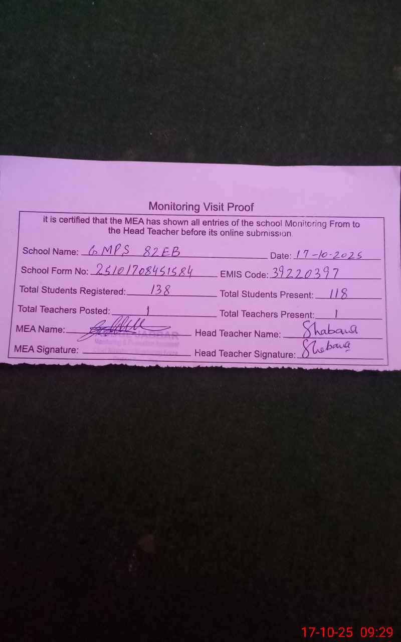 | EMIS Code: 39220397 | Name of School: GMPS 82/EB PO 66/EB ARIFWALA DISTT PAKPATTAN | |||