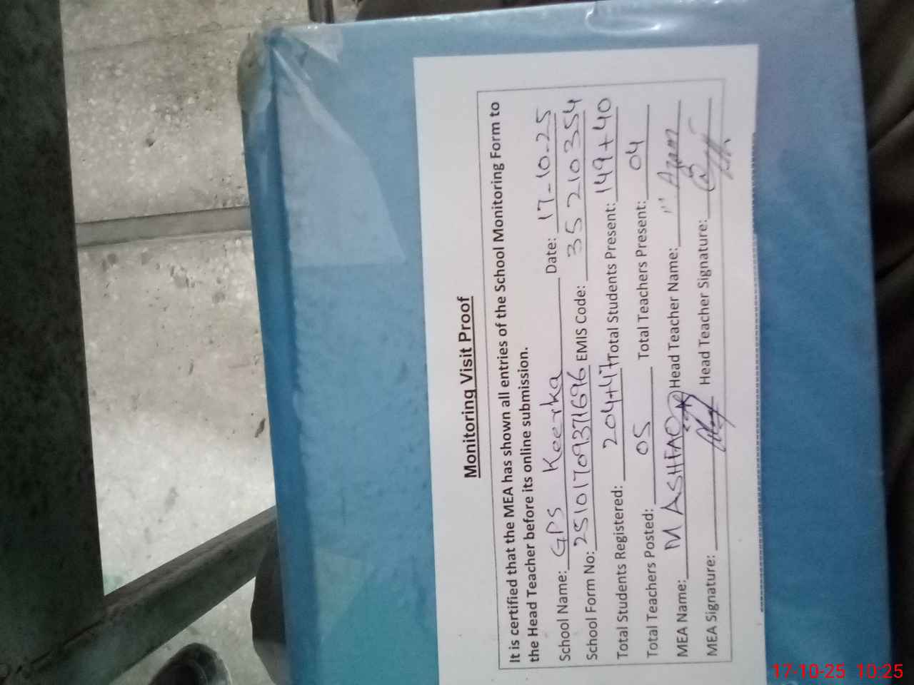 | Attendance Register | Head Teacher | MEA with School | Visit Proof |