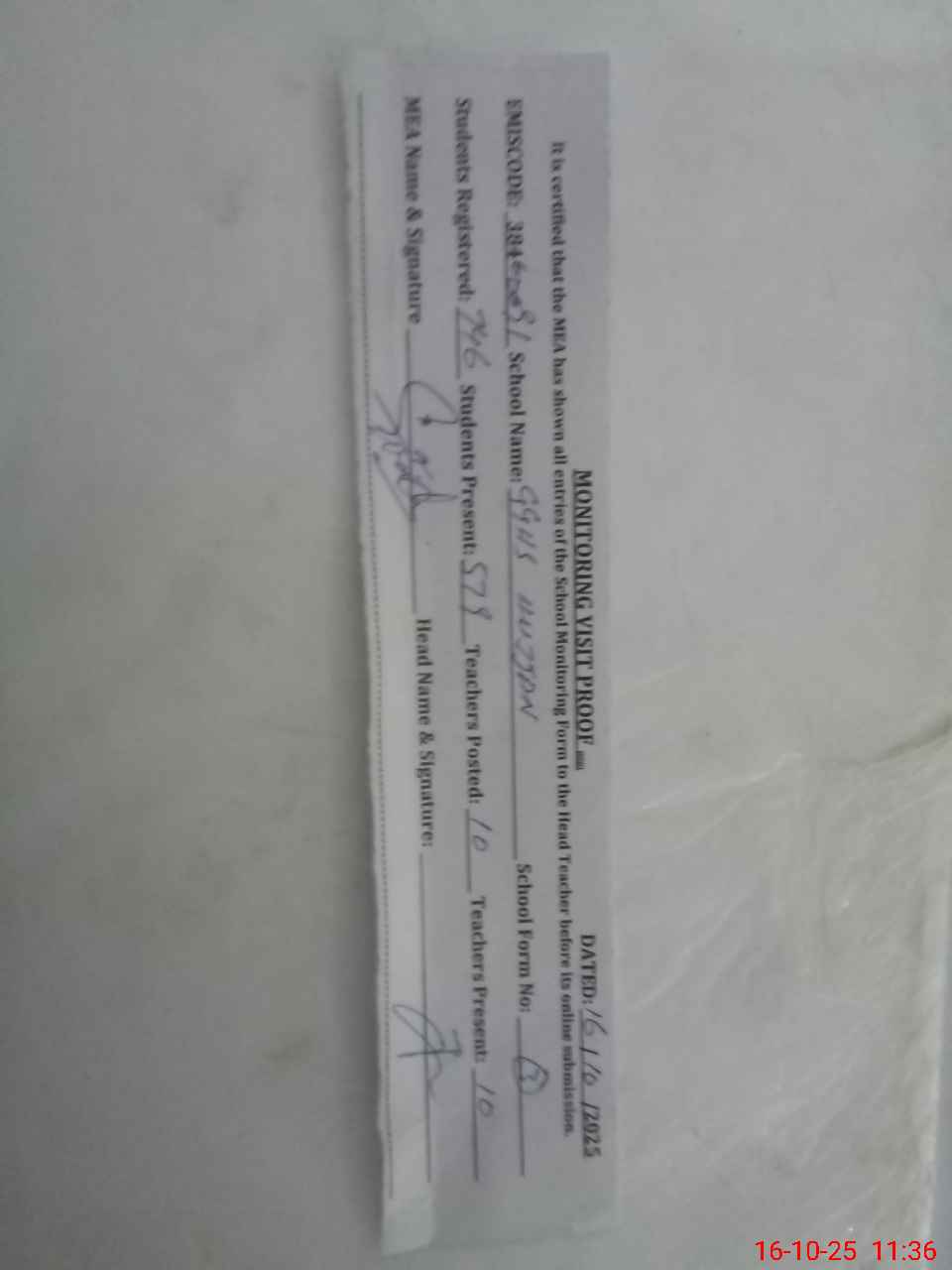 | Attendance Register | Head Teacher | MEA with School | Visit Proof |