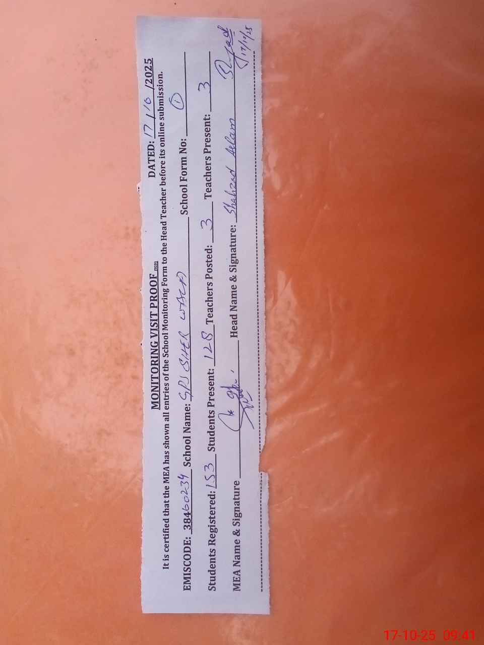 | Attendance Register | Head Teacher | MEA with School | Visit Proof |
