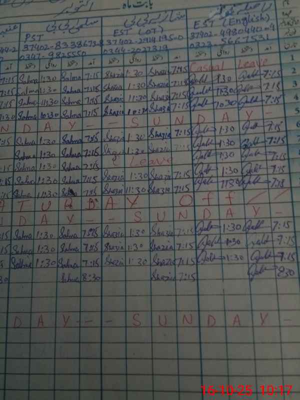 | CNIC | Full Name | Designation | R/C | Absence During Last Calender Month |