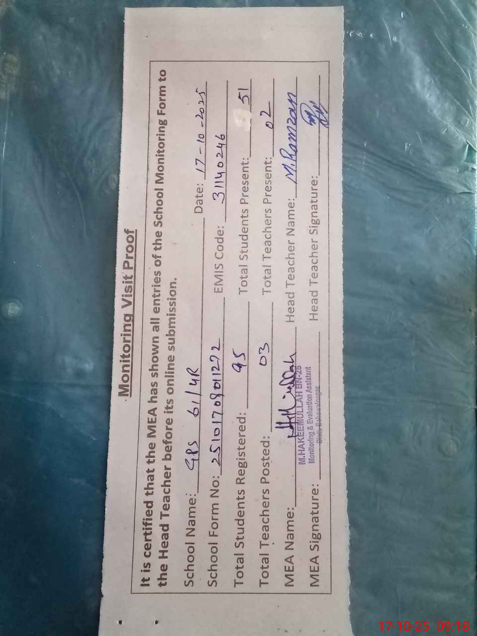 | Attendance Register | Head Teacher | MEA with School | Visit Proof |