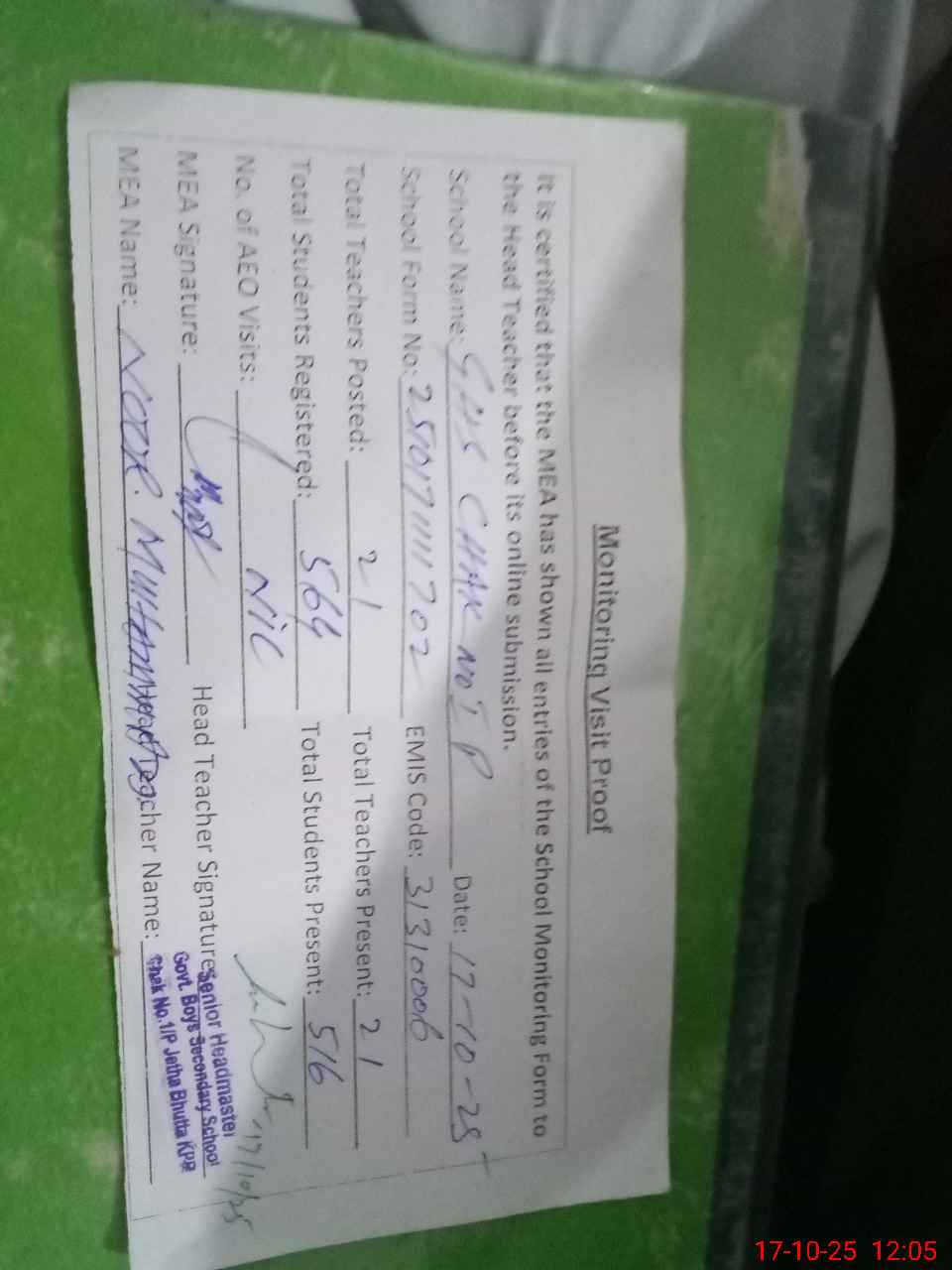 | Attendance Register | Head Teacher | MEA with School | Visit Proof |