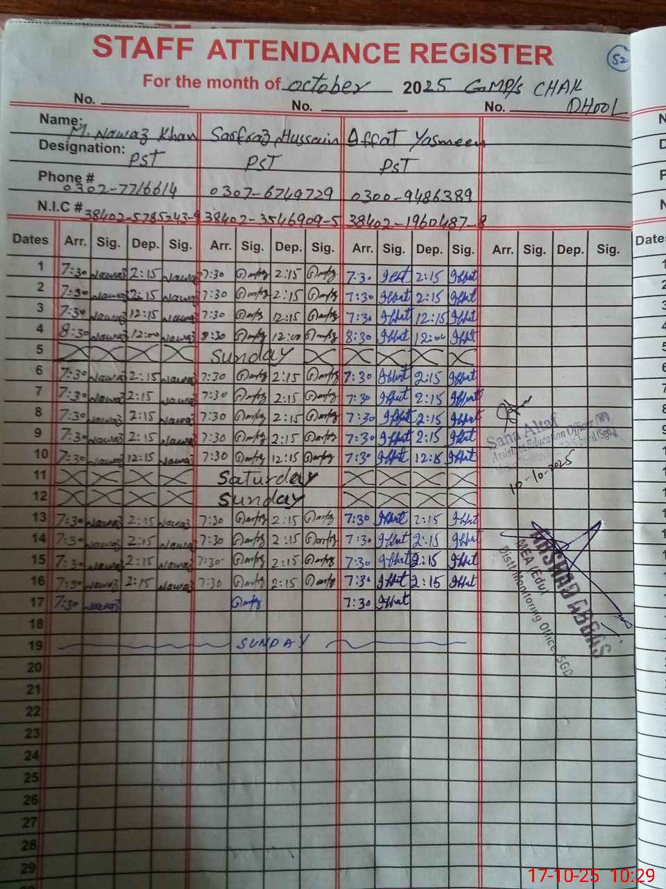 | CNIC | Full Name | Designation | R/C | Absence during last cal. month |