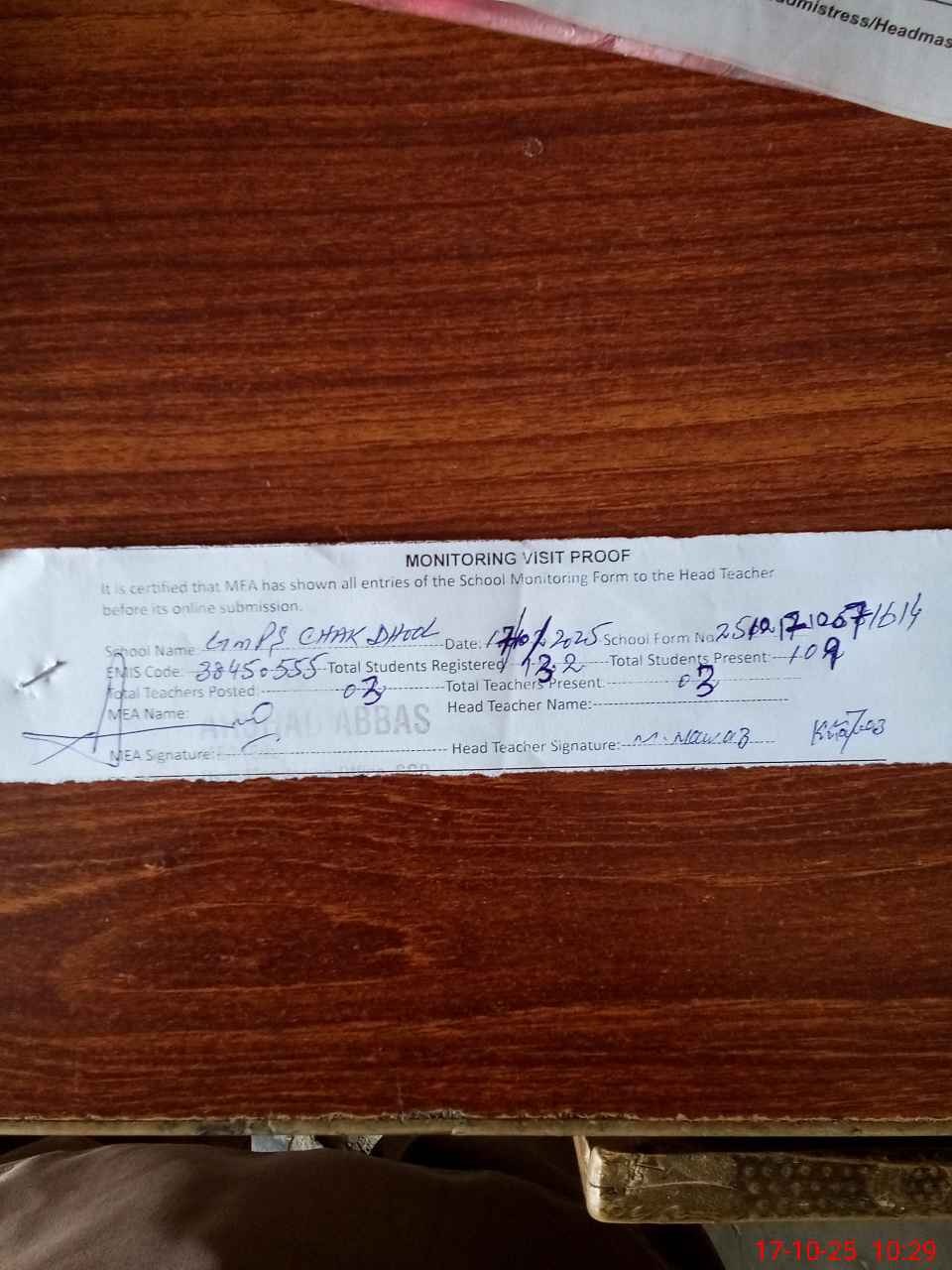 | Attendance Register | Head Teacher | MEA with School | Visit Proof |