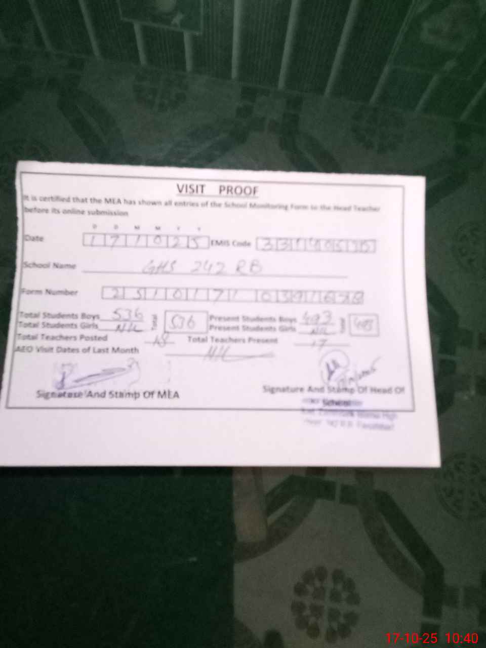 | Attendance Register | Head Teacher | MEA with School | Visit Proof |