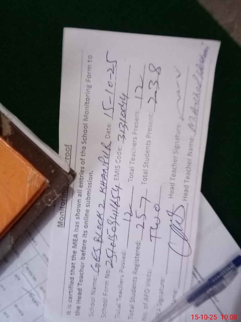 | Attendance Register | Head Teacher | MEA with School | Visit Proof |