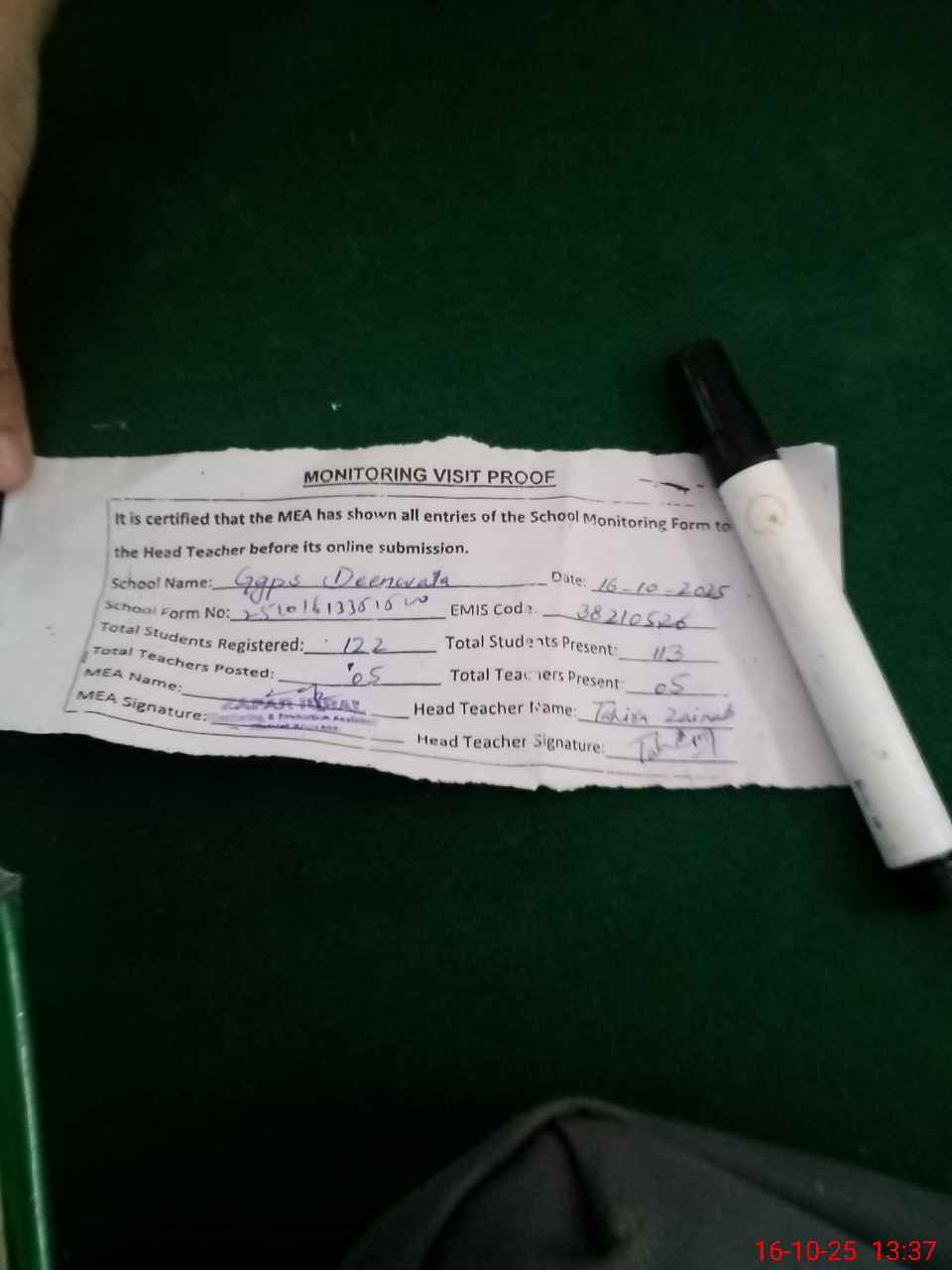 | Attendance Register | Head Teacher | MEA with School | Visit Proof |