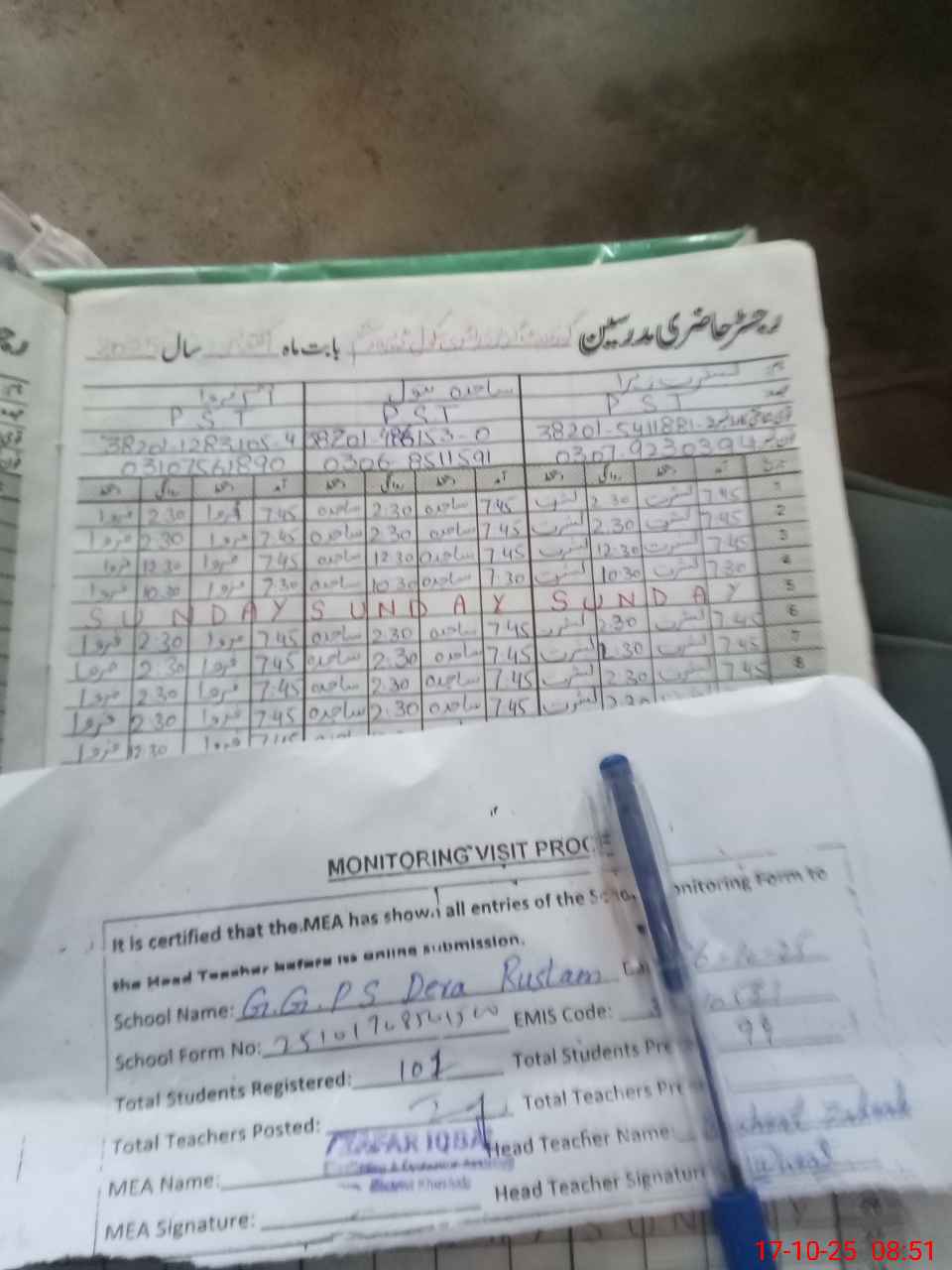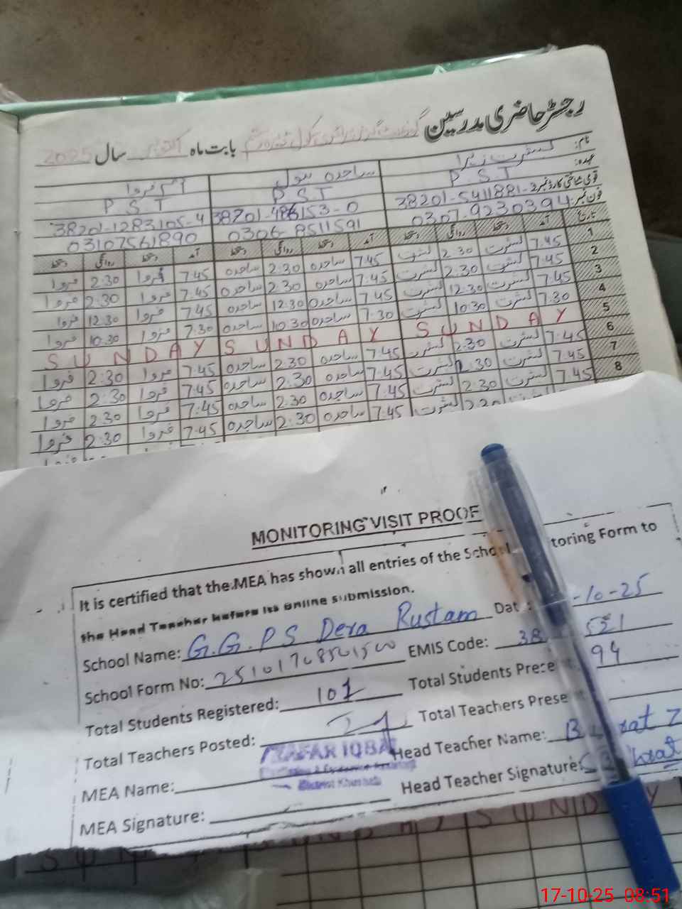 | Attendance Register | Head Teacher | MEA with School | Visit Proof |