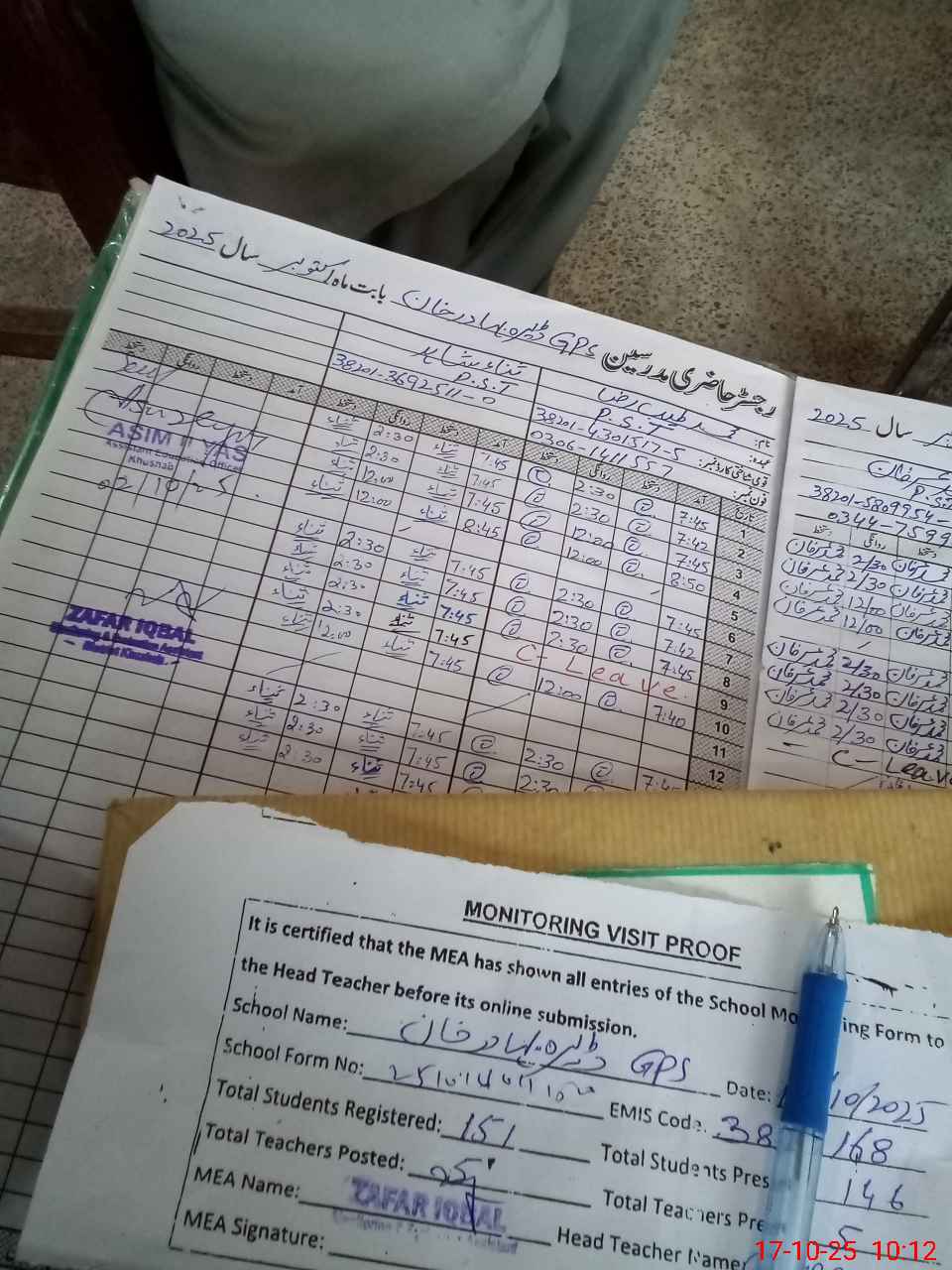 | Monitoring Date: 17-10-2025 | Start Time: 17-10-2025 10:05 AM | End Time: 17-10-2025 10:55 AM | Name of MEA: ZA**** IQ**** | |