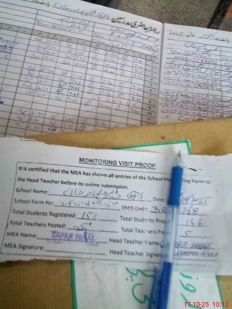 | Attendance Register | Head Teacher | MEA with School | Visit Proof |