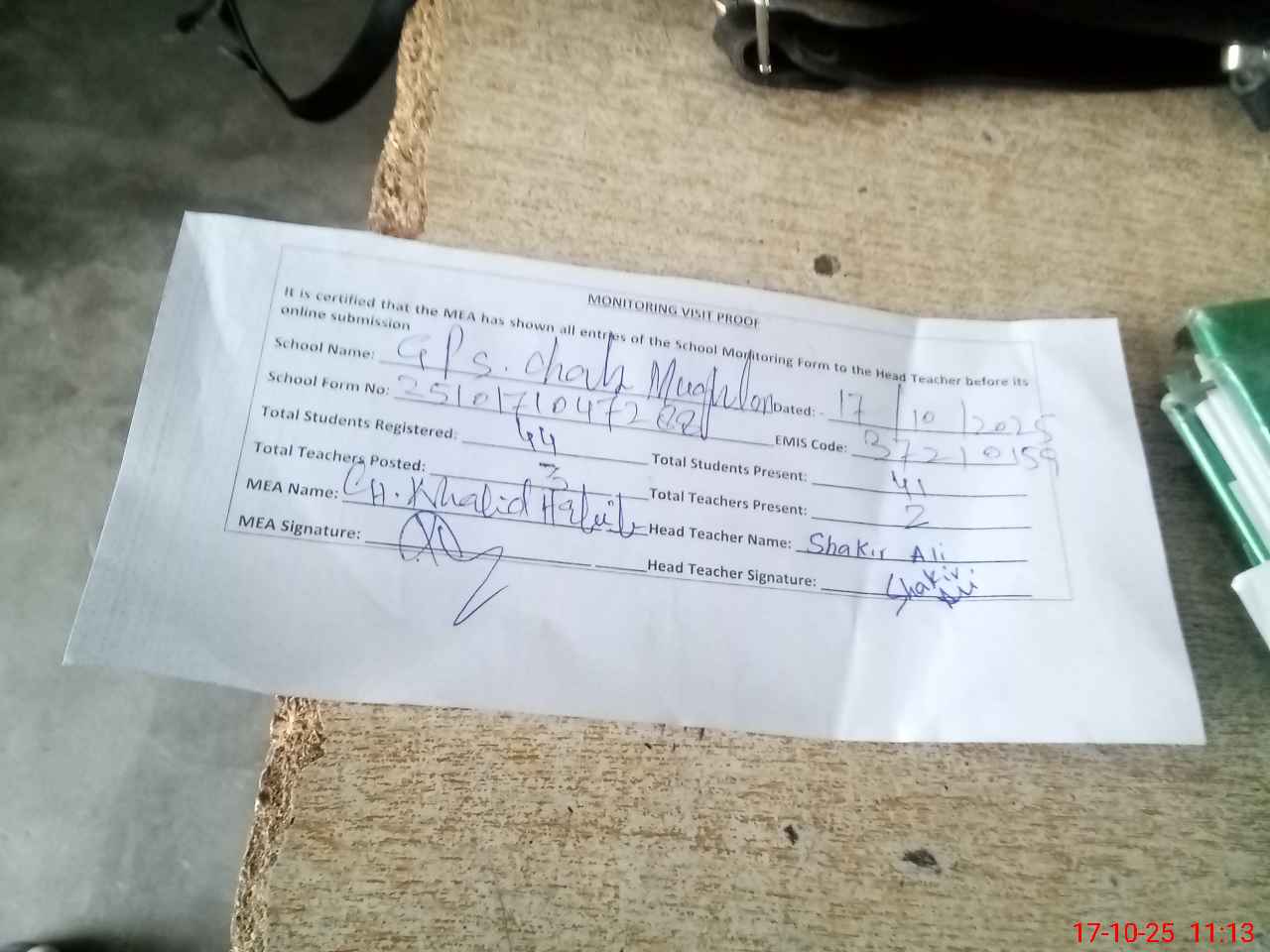 | Attendance Register | Head Teacher | MEA with School | Visit Proof |
