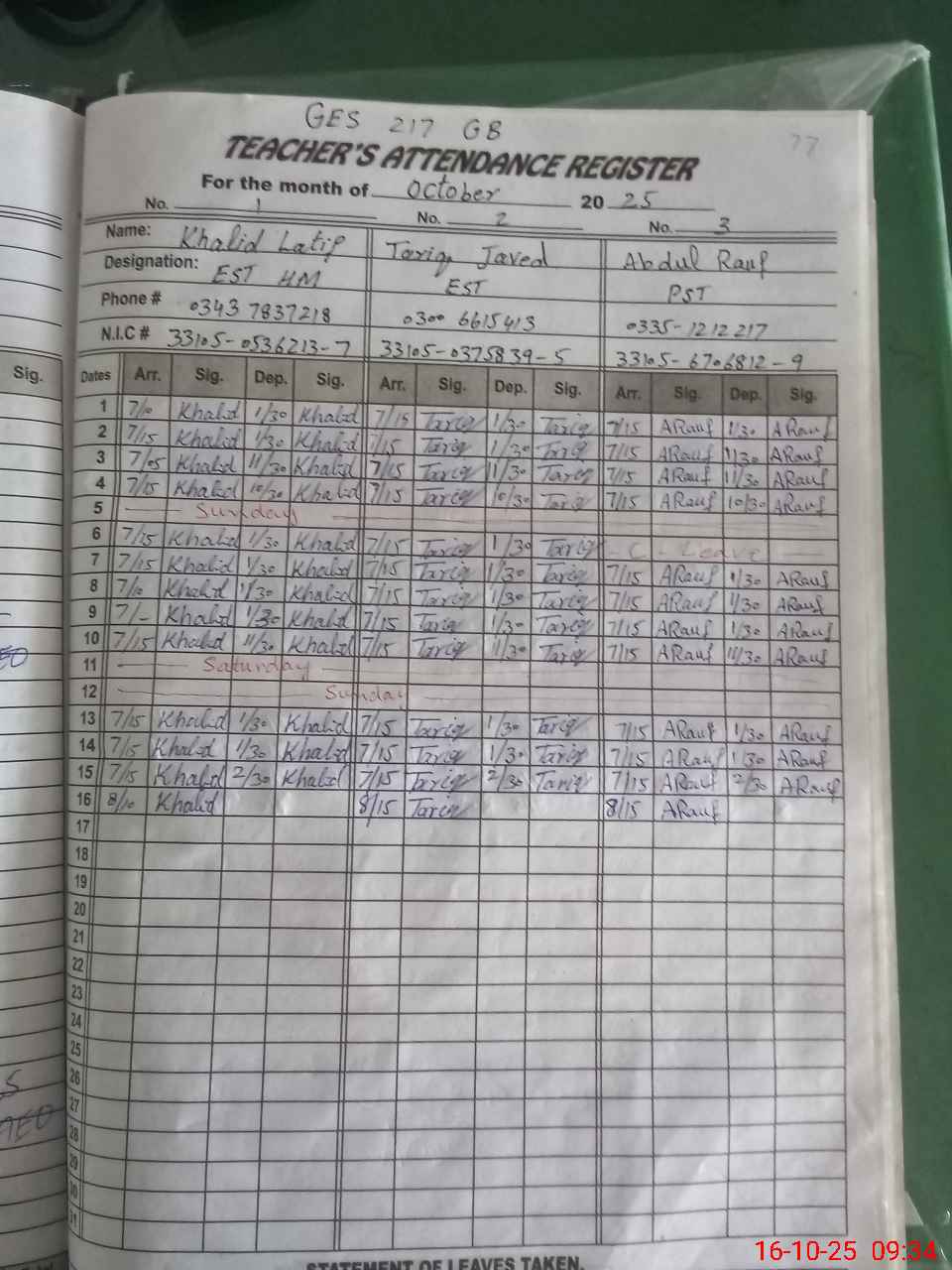 | CNIC | Full Name | Designation | R/C | Absence during last cal. month |