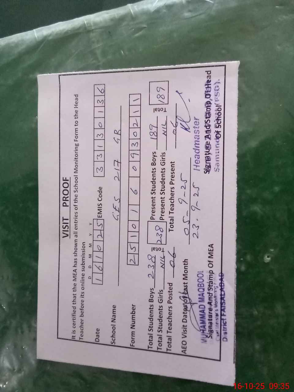| Certified that this School was Inspected by the Undersigned MEA/DMO Today and the Information Stated Above is as Per Record. | |||||