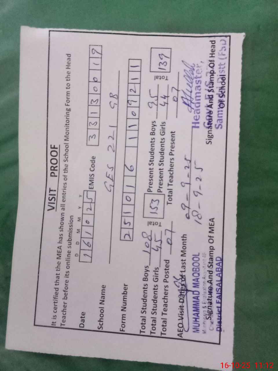 | Attendance Register | Head Teacher | MEA with School | Visit Proof |